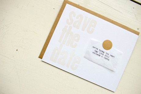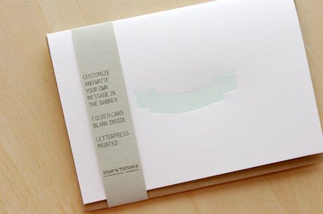 I submit the work of Toronto’s Snap & Tumble as proof that a muted, neutral palette looks elegant and completely amazing! The save the date above is customizable in myriad ways, limited only by your own creativity, and the banner card below just begs for a personalized greeting. You can see more at the Snap & Tumble website, shop, and blog.
