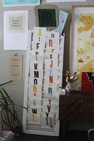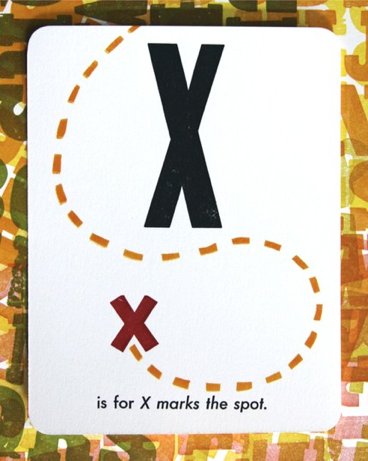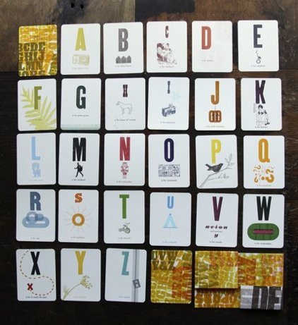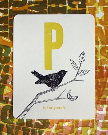 Love this fresh take on alphabet cards, from Black Dog Art + Press: I’m able to imagine them in adult and kids’ settings. (Put me down for a “P”, please.) Available at Etsy; $5 a card.
