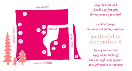 Oh, you lucky Bostonians: tonight is the South End Holiday Night Out. Read more about it at All Stripes, and report in: I’ll be at home watching The Beekman Boys’ holiday special (have missed seeing Polka Spot).